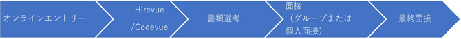 ![]() ※Codevueはグローバルテクノロジー部のみ該当します。 ※締切日までに、エントリーシート及びビデオ面接の提出を完了されなかった方は、書類選考には進めませんのでご注意ください。