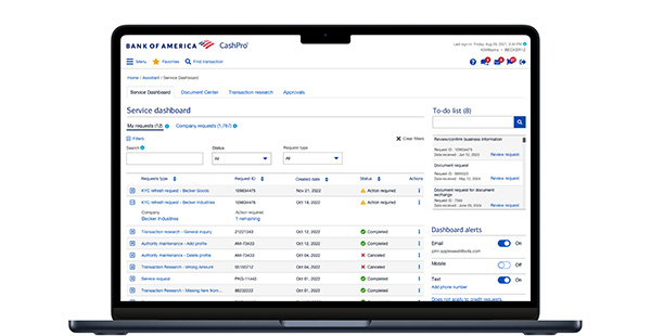 Get the data and answers you need, now. CashPro service tools are seamlessly integrated within your CashPro experiences to ensure your workflows are uninterrupted. They help you easily perform day-to-day tasks and make more informed decisions.
