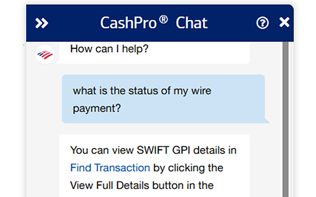“What I found impressive is that we can use CashPro Chat to answer simple questions about a wire deadline or a deposit. That’s been very helpful to us.”